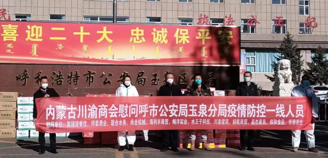 11月7日,内蒙古川渝商会执行会长兼餐饮分会会长王勇组织并亲自带队向呼和浩特市玉泉区公安分局捐赠价值25650元的抗疫物资,我商会会员王全中、王学英随同采买并运送、装卸物资,向守护青城平安的公安人员表达最真挚的敬意和最真切的关心,你们辛苦了!内蒙古川渝商会将与全城人民一起共克时艰,打赢这场没有硝烟的疫情狙击战。