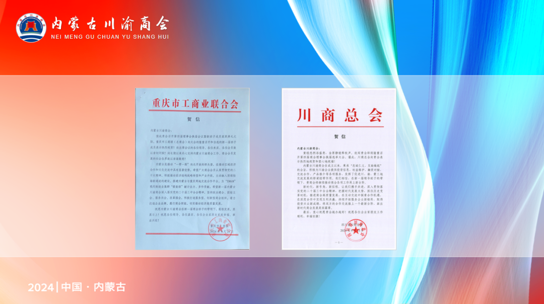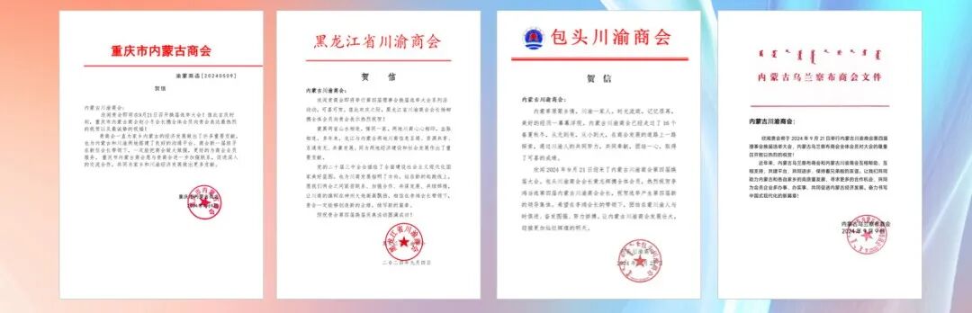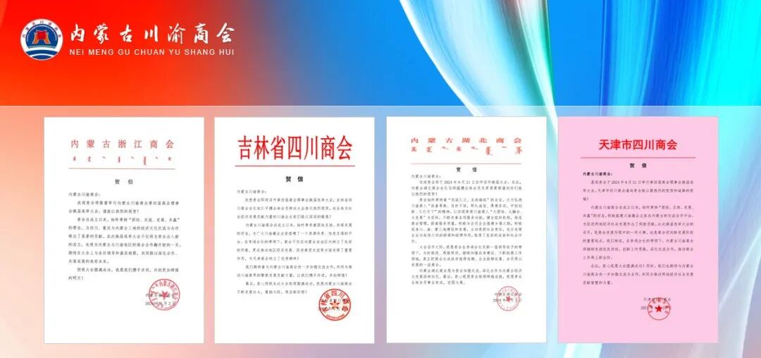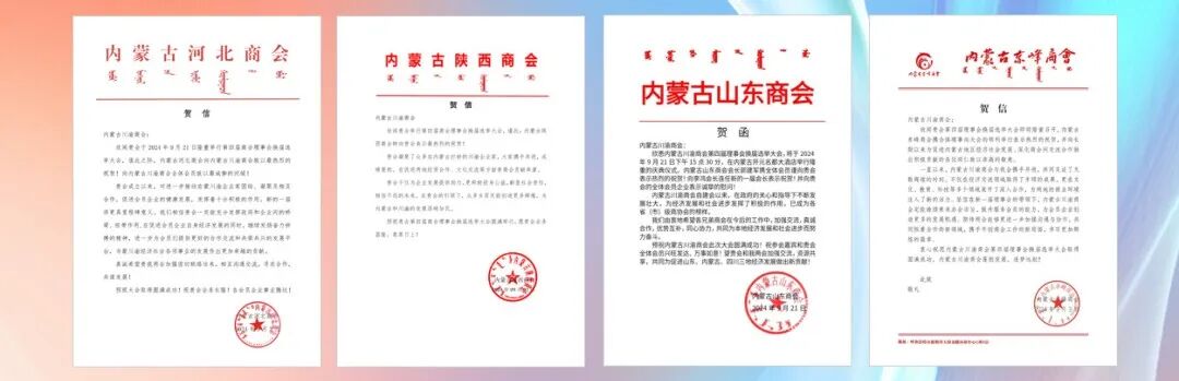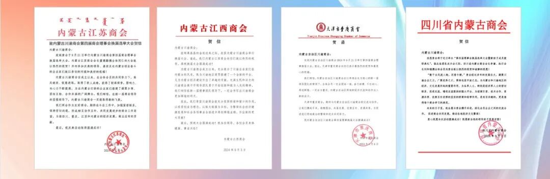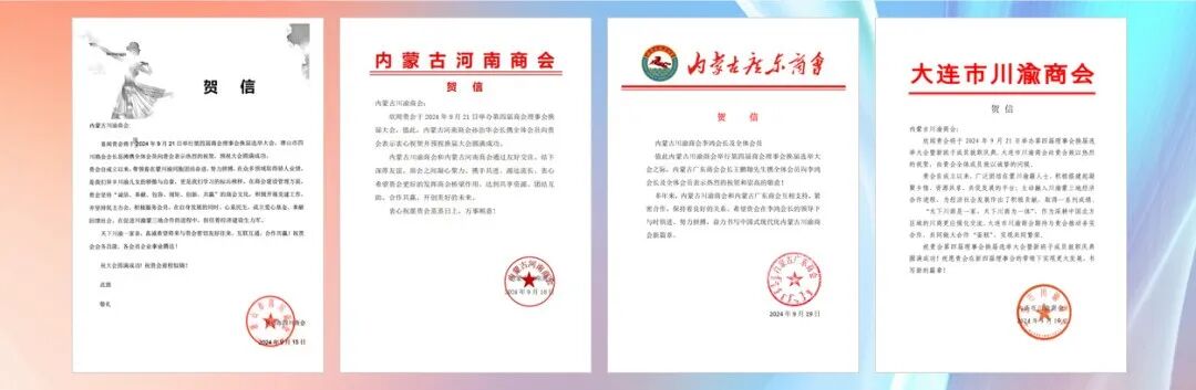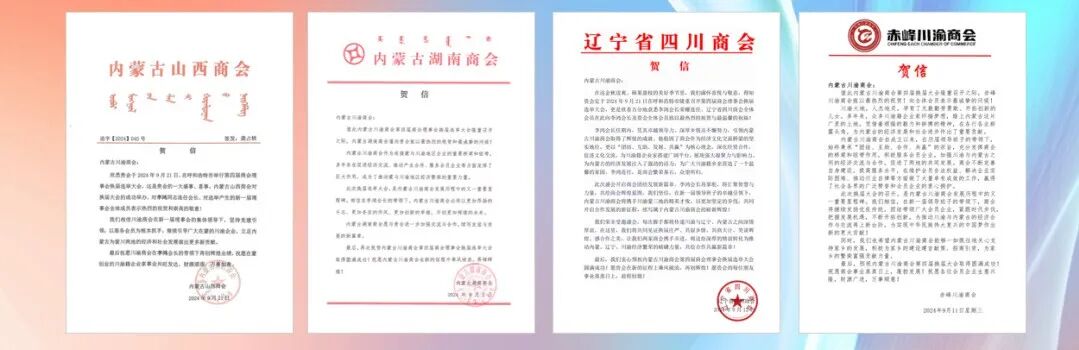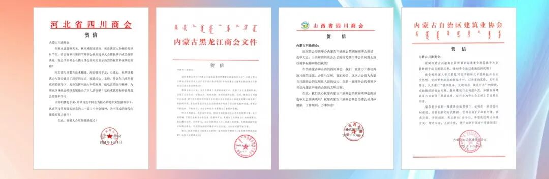 内蒙古自治区党委对口联系商会领导、四川省经合局、四川省工商联、重庆市工商联、川商总会、各友好商协会通过各种方式向大会的圆满召开表示祝贺。