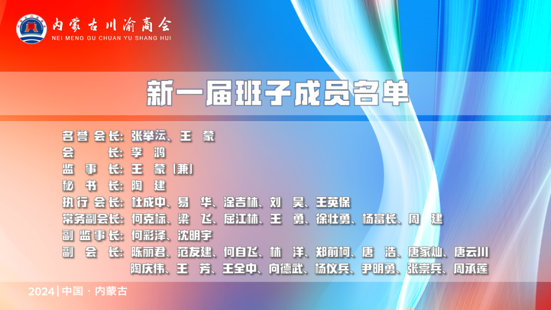 大会在庄严肃穆又充满热情的氛围中正式启动。会议伊始,全体起立,奏唱国歌。随后播放了商会第三届工作回顾短片,在展示商会过去五年取得的成绩的同时,也展示了会员间的紧密合作与不懈努力。第三届商会会长李鸿作《内蒙古川渝商会第三届工作情况报告》、监事长何彩泽作《内蒙古川渝商会第三届财务情况报告》。根据《商会章程》要求,审议通过《内蒙古川渝商会章程修改案》、《内蒙古川渝商会第四届商会会费标准及收取办法》、《商会换届选举办法》,并成功选举产生了新一届商会会长、监事长、执行会长、常务副会长、副监事长、副会长等领导班子成员。新一届领导班子的产生,标志着内蒙古川渝商会迈入一个新的发展阶段。自治区党委统战部副部长、工商联党组书记梁淑琴亲临现场,向新当选的商会领导班子致以热烈的祝贺。她充分肯定了内蒙古川渝商会五年来的工作。她说,商会领导班子团结带领广大会员围绕“四好”商会建设标准,发挥服务党委政府、会员企业和市场间的桥梁纽带助手作用,在加强党建引领、搭建政企沟通桥梁、服务会员企业、践行社会责任、做好川籍农民工服务工作、加强自身建设等方面做出大量卓有成效的工作并取得显著成效。她强调,内蒙古川渝商会作为连接川、渝、蒙三地经济文化的桥梁和纽带,始终肩负着服务会员企业、促进三地交流合作的重要使命。希望在李鸿会长的带领下,新一届领导班子能够继续发扬优良传统,创新工作思路,为商会民营企业提供更加优质高效的服务,为内蒙古的经济社会发展贡献更多智慧和力量。